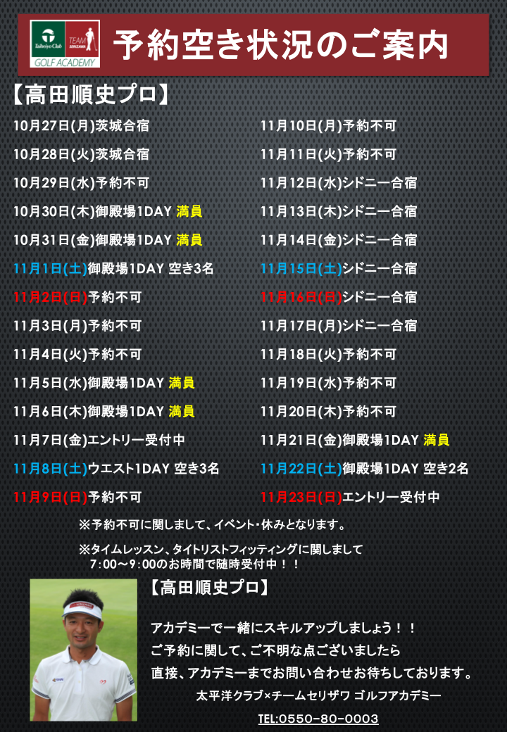 高田順史ヘッドプロのレッスン空き状況をご案内させて頂きます