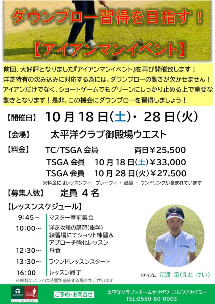 前回、大好評となりました『アイアンマンイベント』を再び開催致します! 洋芝特有の沈み込みに対応する為には、ダウンブローの動きが欠かせません! アイアンだけでなく、ショートゲームでもグリーンにしっかり止める上で重要な動きとなります!