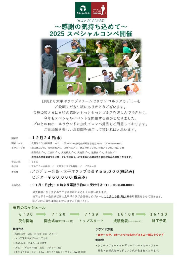 日頃の感謝を込め、チームセリザワのツアープロやアカデミースタッフとラウンドを楽しむスペシャルコンペを開催いたします。