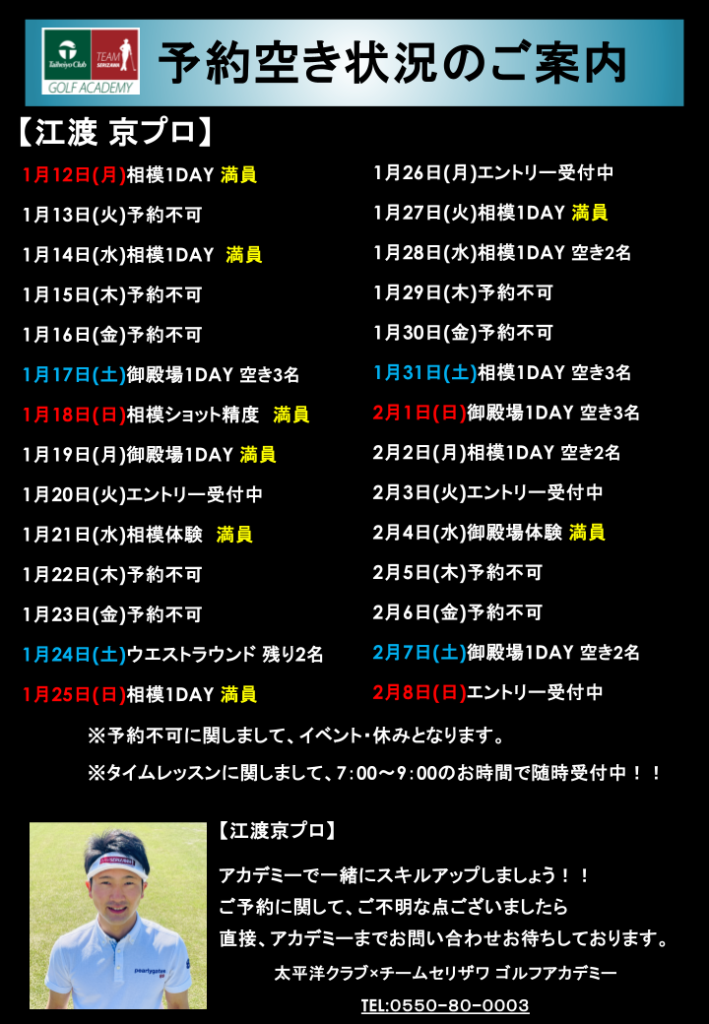 江渡京プロのレッスン空き状況をご案内させて頂きます