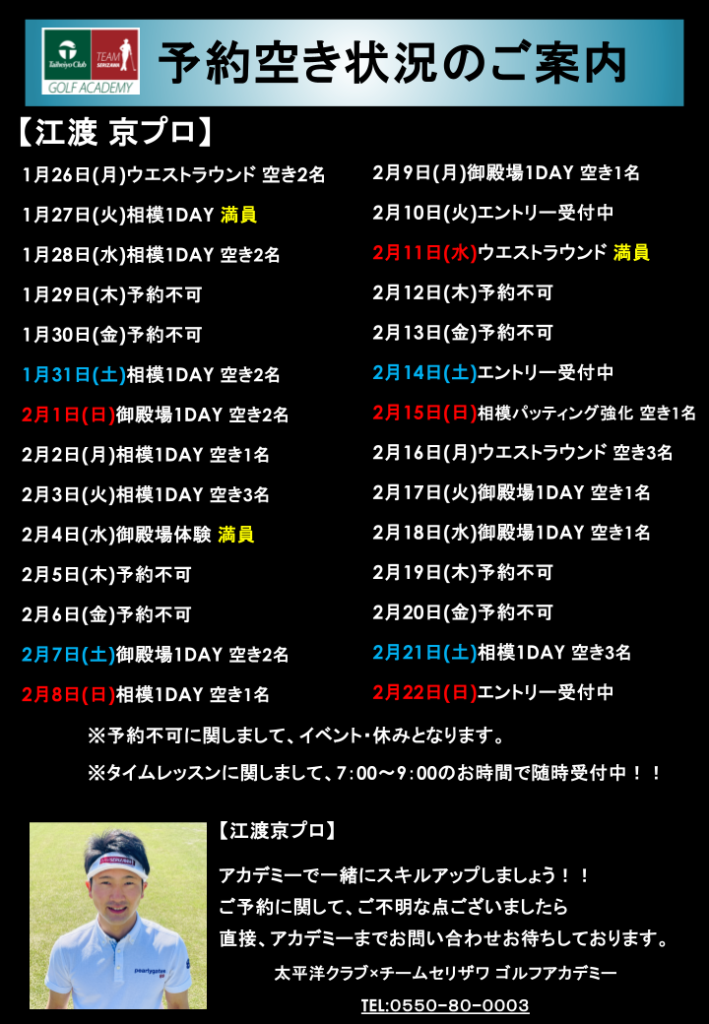 江渡京プロのレッスン空き状況をご案内させて頂きます