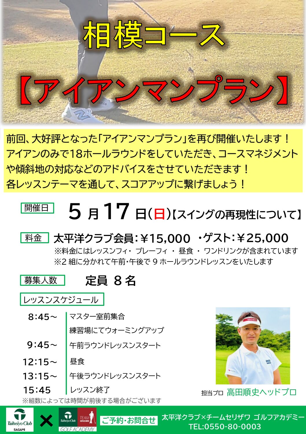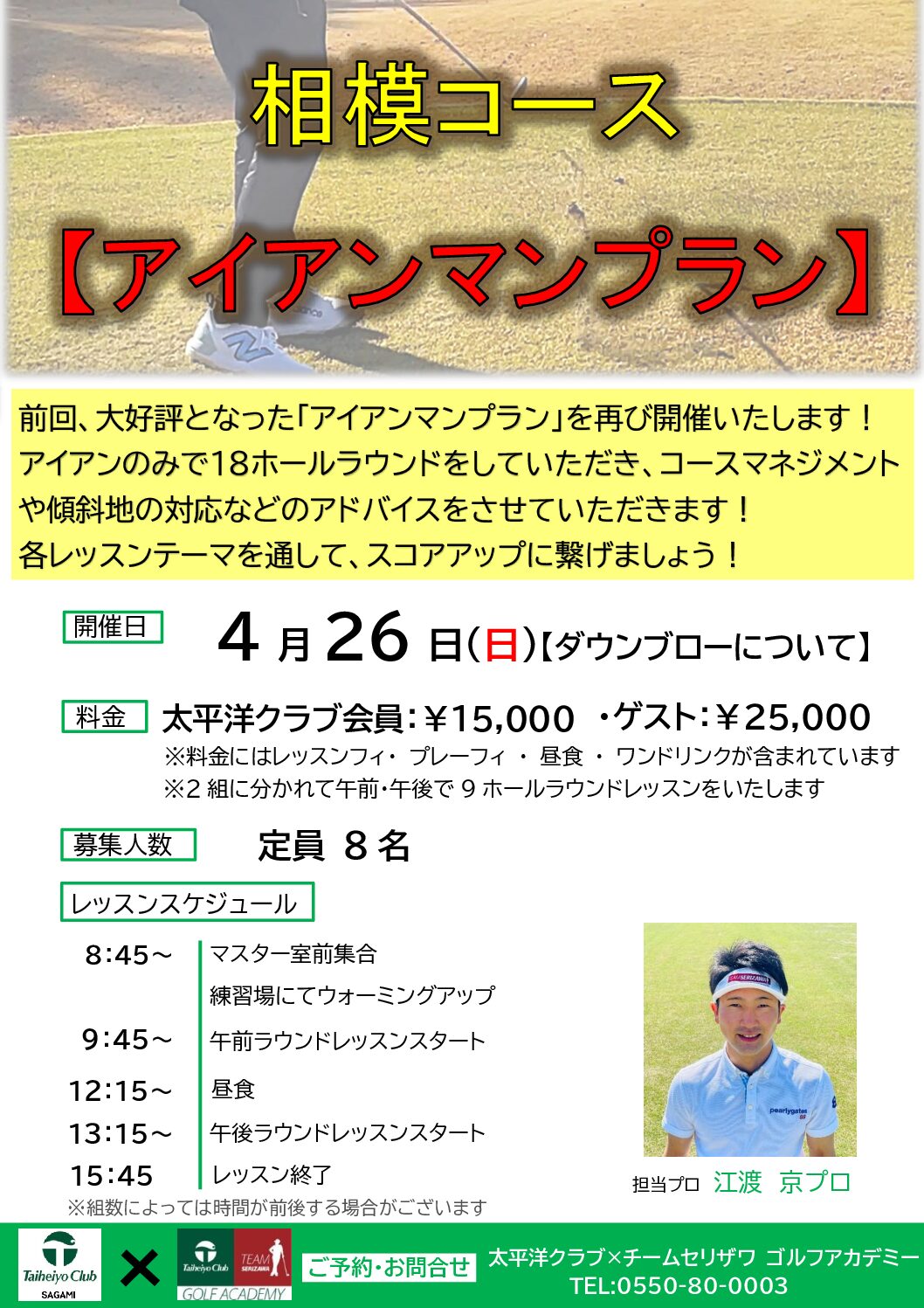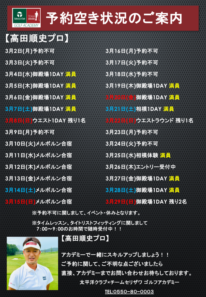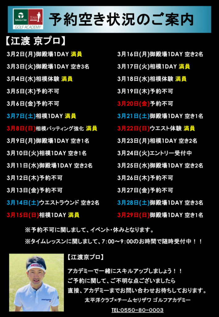 江渡京プロのレッスン空き状況をご案内させて頂きます