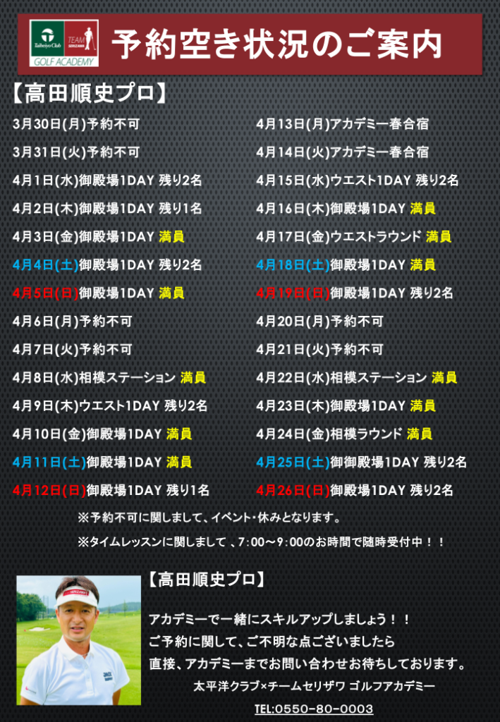 高田順史ヘッドプロのレッスン空き状況をご案内させて頂きます