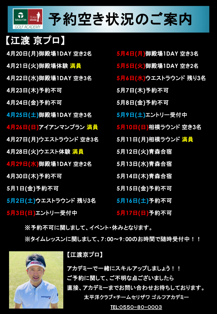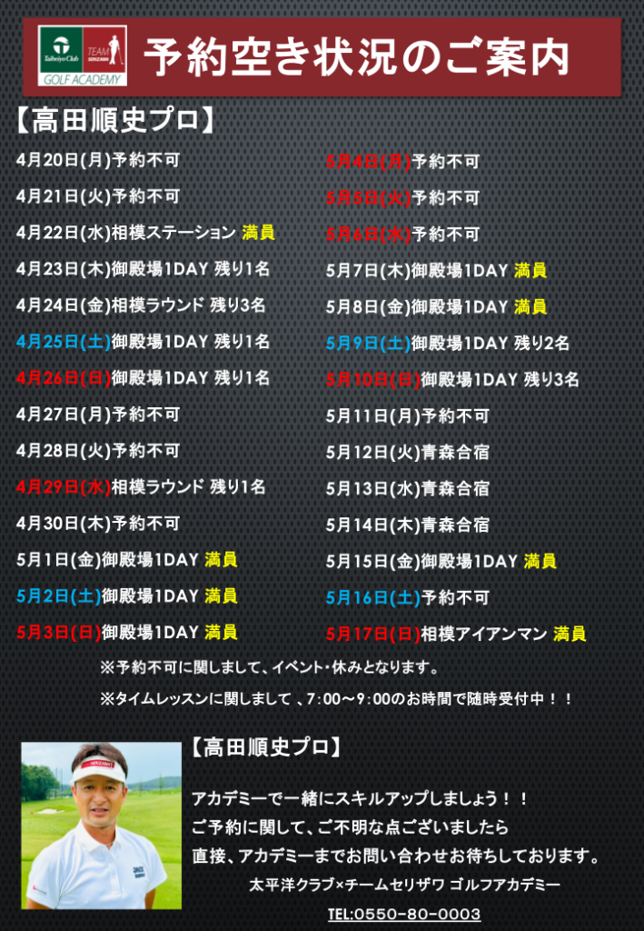 高田順史ヘッドプロのレッスン空き状況をご案内させて頂きます