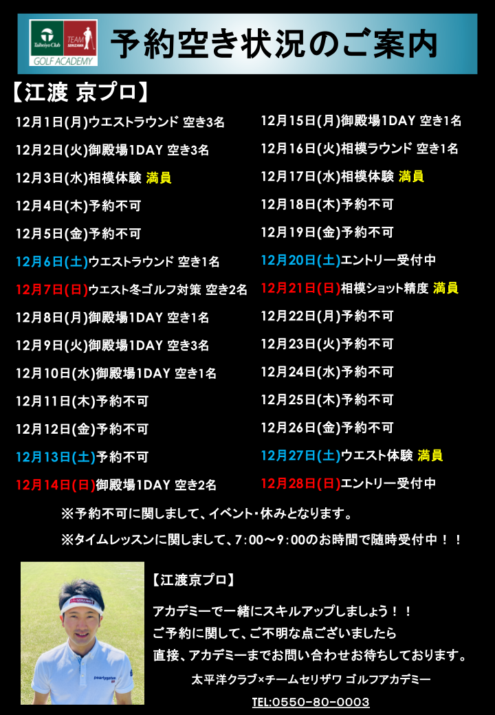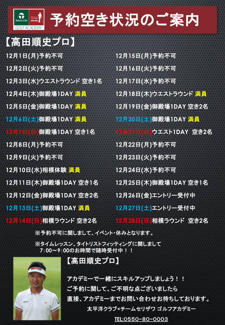 日頃より当アカデミーをご利用いただき誠にありがとうございます。 8月14日(火)~8月20日(月)の期間、 LPGAツアー【CAT Ladies】開催の為 当アカデミーはクローズとさせていただきます。 […]