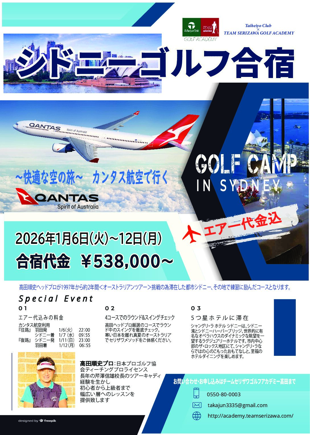 2026アカデミー海外合宿 第一弾。 【シドニー&メルボルン ゴルフ合宿】を開催い致します。 今回は2週に渡って、2都市を巡るキャンプとなります。 シドニーは高田プロが、かつて暮らしていた都市 […]