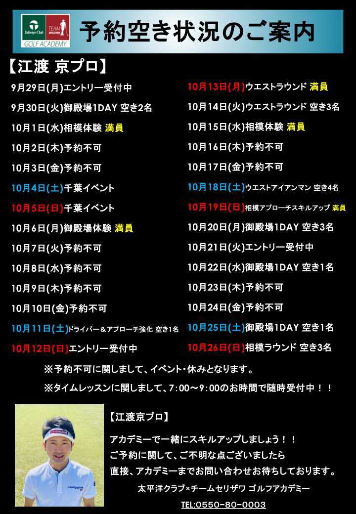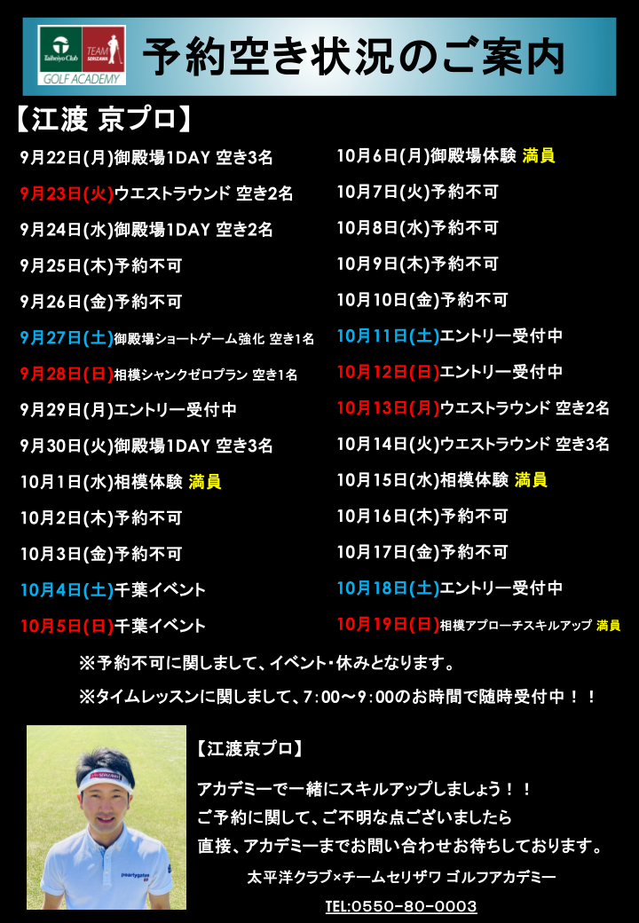 江渡京プロのレッスン空き状況をご案内させて頂きます ご希望のお日にちをご確認頂き、ご予約お待ちしています